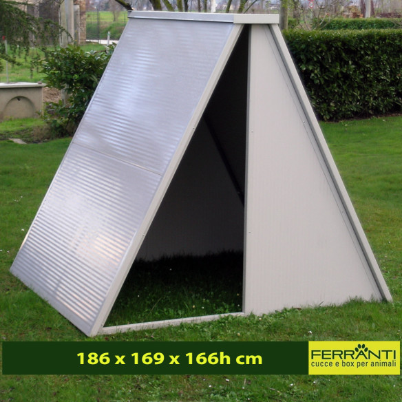 - 186 x 169 x 166h cm (Abri mod. Petit) – Dimensions internes : 175 x 150 cm – Jusqu’à 3 animaux