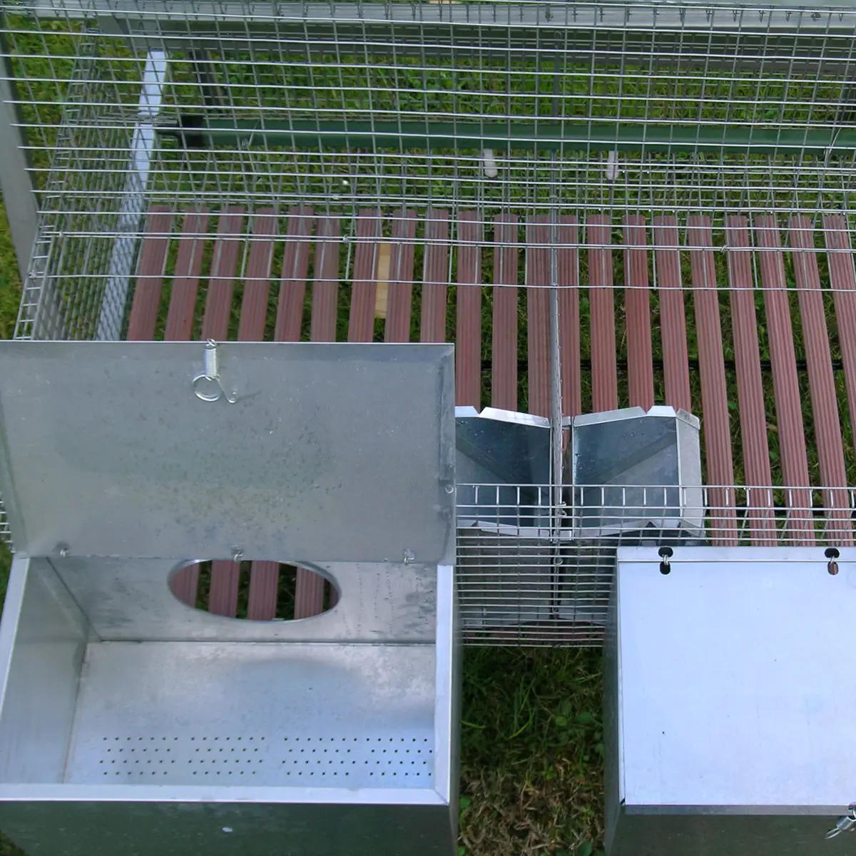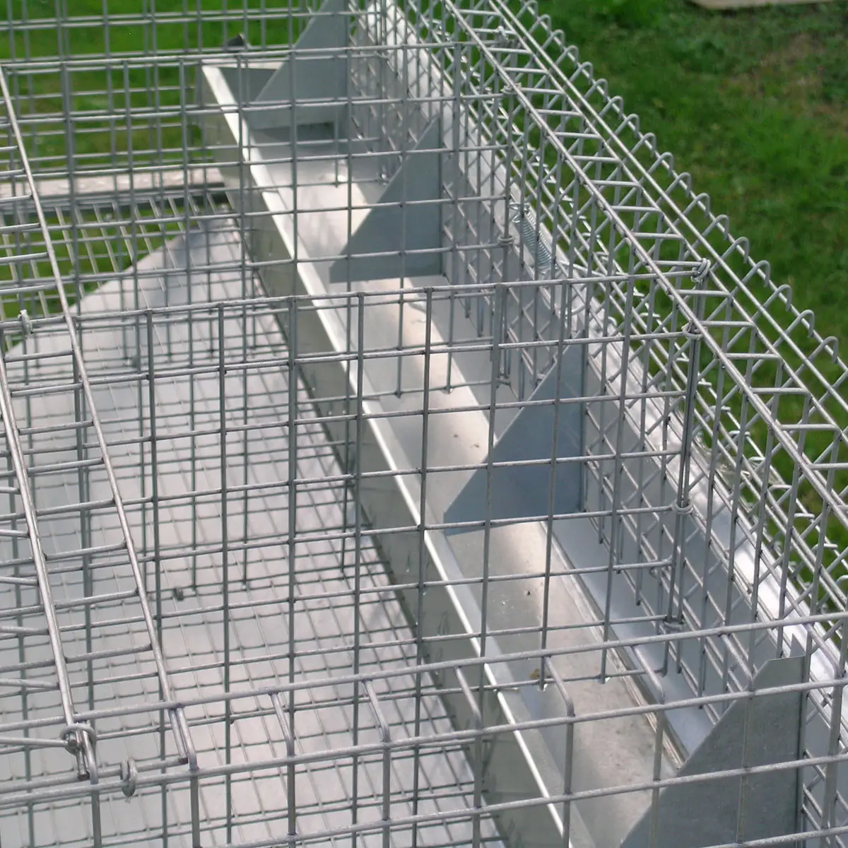 - fond pour lapines plat, en barres plastiques, conçu pour prévenir les plaies aux pattes; des compartiments d'engraissement en maille galvanisée 12 x 25 mm (fil 1,4 mm)