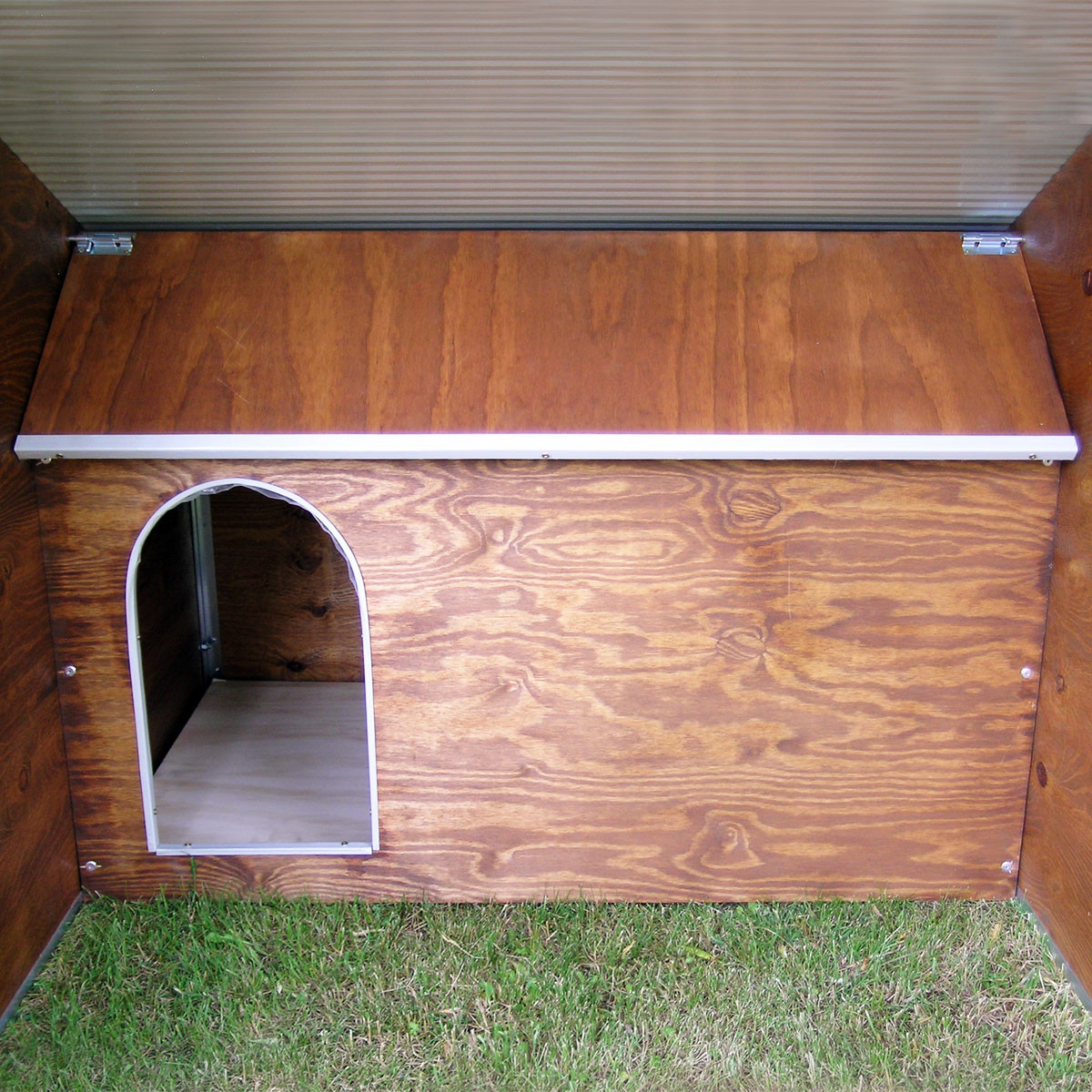 - niche intérieure en bois (125 x 65 x 85h, avec entrée "anti-morsure" mesurant 27 x 47h), inspectable en soulevant le toit et dotée d'une plate-forme en bois surélevée du sol, amovible et lavable