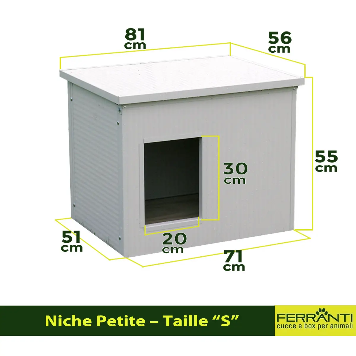 - Niche pour Chien Extérieure Isolée Taille Petite, fabriquée entièrement en panneaux isolants de 3,5 cm d’épaisseur et encadrée de profilés en tôle galvanisée pour garantir robustesse et excellente isolation thermique.
