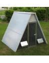 - matériaux : toit isolé en panneaux de 3,5 cm d'épaisseur, encadrés de profilés en tôle, contreplaqué marin traité arrière et grillage avant, maille 25 x 25 mm, épaisseur 2 mm